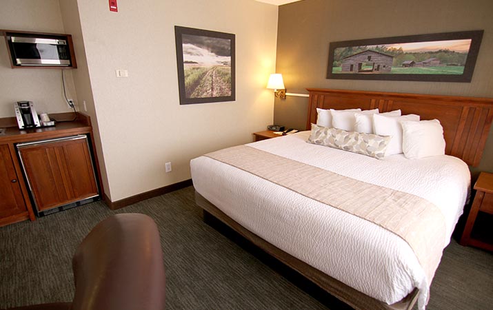 One of our specialty rooms with a King Size Super Pillow Top Bed. This room includes an additional entry to the indoor courtyard as well as an in-room jacuzzi and sitting area.