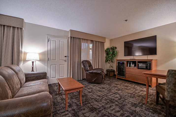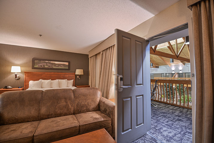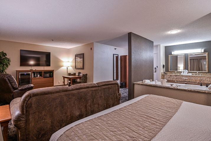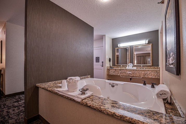 One of our specialty rooms with a King Size Super Pillow Top Bed. This room includes an additional entry to a private balcony as well as an in-room jacuzzi, and sitting area.