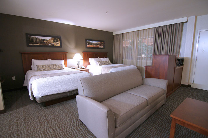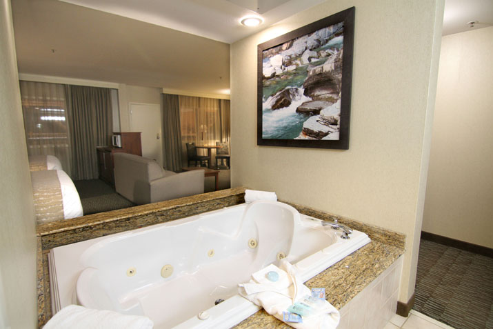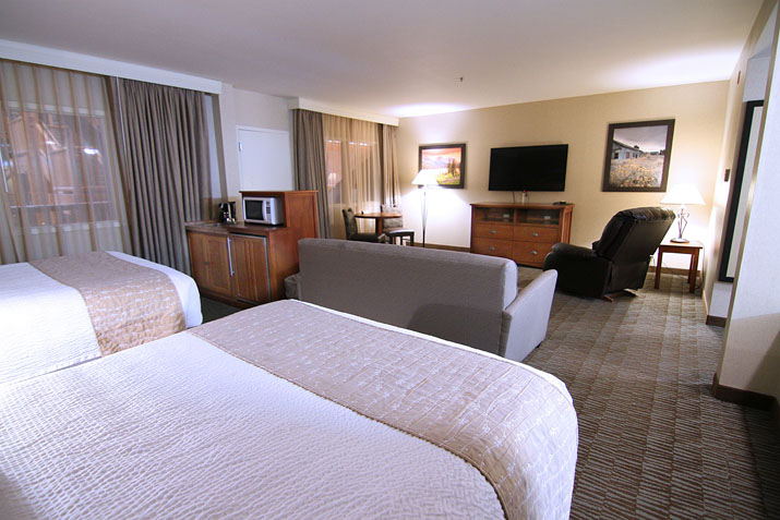 One of our specialty rooms with two Queen Size Super Pillow Top Beds. This room includes an in-room jacuzzi, and sitting area.